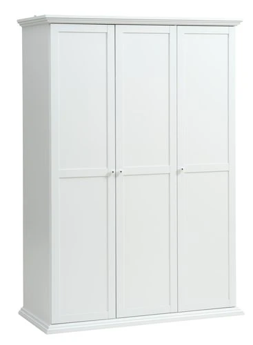 En panneau de particules, placage feuille. Pieds : plastique. Intérieur de garde-robe : 5 étagères et 1 tringle à vêtements. 3 portes. l140 x H200 x P64 cm