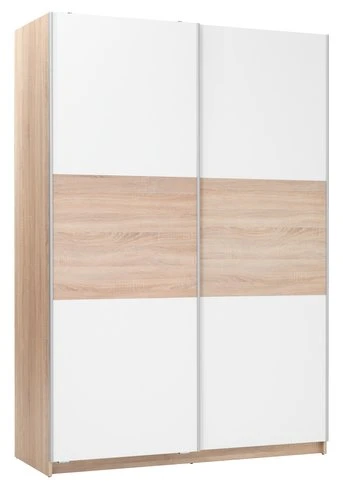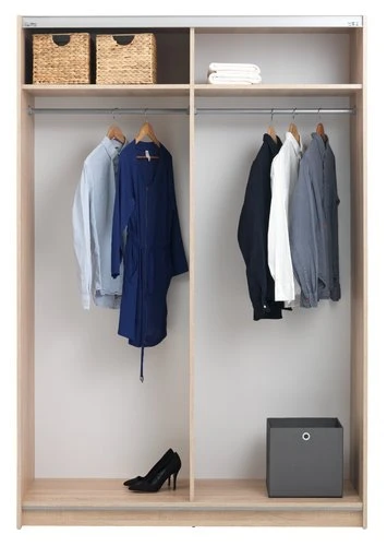 En panneaux de particules placage mélamine et acier. Intérieur : 2 tringles, 2 étagères. 2 portes coulissantes. l151 x H219 x P60 cm