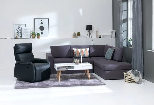 Structure : contreplaqué et métal. Revêtement : polyuréthane. Garnissage : mousse polyuréthane (18/24 kg/m³). Repose-pied intégré, mécanisme de basculement. l76 x H105 x P92 cm