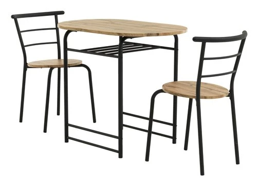 Plateau de table, assise : MDF revêtement mélamine. Structure, piètement, dossier : acier. Table + 2 chaises. l55/46 x L92/50 x H75/77 cm