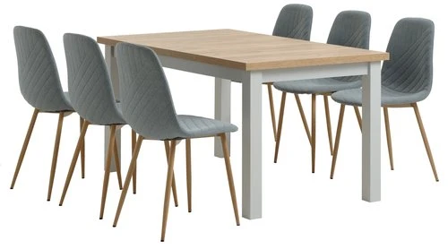 Table : plateau : panneau de particules mélaminé. Pieds : HDF, pin et épicéa massifs. Incl. 1 rallonge à ranger sous le plateau de la table. l90 x L150/193 x H75 cm. Chaise : structure : contreplaqué. Garnissage : mousse polyuréthane (20 kg/m³). Revêtement : polyester. Piètement : acier. l44 x H87 x P53 cm
