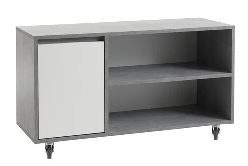 En panneau de particules. Cadre : panneau de particules mélaminé. Surface : stratifié haute pression. Piètement : acier. 1 porte, 1 étagère, 4 roulettes. l110 x H64 x P40 cm