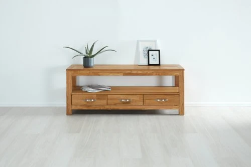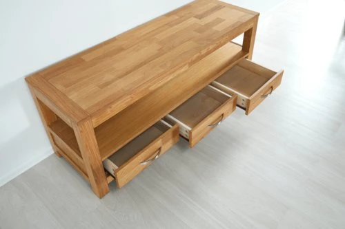 Chêne massif et placage chêne. Tiroirs avec glissières d’extension complète. l139 x H55 x P45 cm