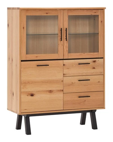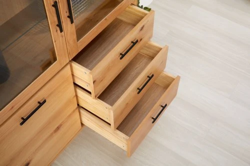 Bois massif, placage chêne et verre trempé. Portes soft-close. Tiroirs soft-close. l109 x H143 x P45 cm
