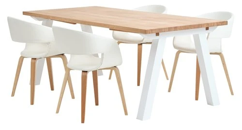 Table : cadre, plateau : placage chêne, chêne massif. Piètement : MDF, bouleau massif, pin massif. Huilé. Excl. rallonges. l90 x L200 x H75 cm. Chaise : structure : contreplaqué. Garnissage : mousse polyuréthane. Revêtement : laine et polyester. Piètement : contreplaqué plaqué chêne. Vernis. l50 x H77 x P53 cm
