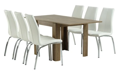 Table : panneau de particules, plateau : mélaminé. Le plateau dépliant permet de doubler facilement la taille de votre table. l80 x L80/160 x H76 cm. Chaise : coque : contreplaqué. Garnissage : mousse polyuréthane (24 kg/m³). Revêtement : polyester. Pieds : acier. l44 x H95 x P59 cm